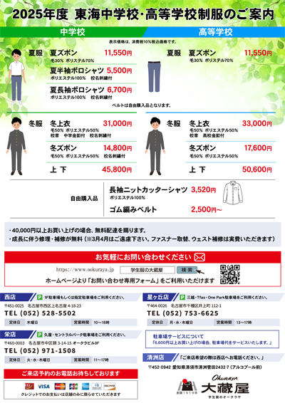 大蔵屋は「気持ちよく着ていただける商品」をお届けするということを方針とし、創業100余年となりました。当社では、東海地方を中心に官公庁への制服・制帽の製造販売や幼稚園、小学校、中学校、高等学校、専門学校、大学などへの学生服等の教育商品を販売しております。